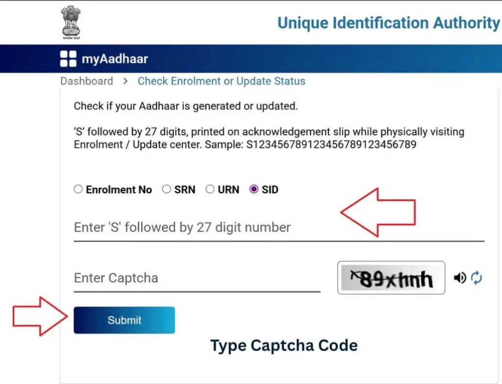 - Enter your Aadhaar number along with the security CAPTCHA.